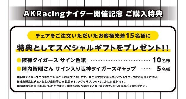 本製品の発売を記念し、6 月 6 日(木)に阪神甲子園球場で行われるプロ野球公式戦 阪神タイガースx 東北楽天イーグルスの試合に冠協賛し、”AKRacingナイター”と題して開催いたします。