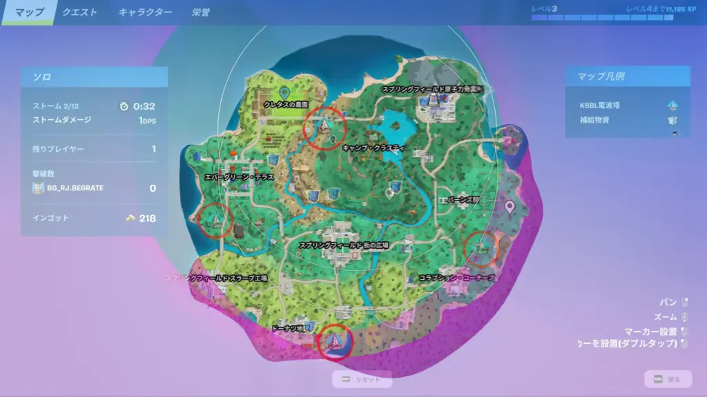 チャプター5の予測塔。次のストームの位置が事前に分かります。今回のパターンは全体のうち2箇所に沸き、そのうちの1箇所にキーを持った中ボス「ドーベルマン」がいます。また沸きのパターンはこれだけではない可能性があるので参考程度にお願いします。