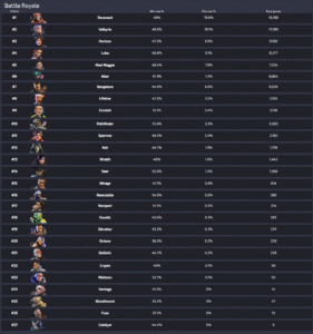 Apexlegendsstatus.comによると約3120万人のプレイヤーによって基づいている『レジェンドの使用率』は現在の下記の様になっているとの事です。