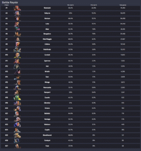 Apexlegendsstatus.comによると約3140万人のプレイヤーによって基づいている『レジェンドの使用率』は現在の下記の様になっているとの事です。