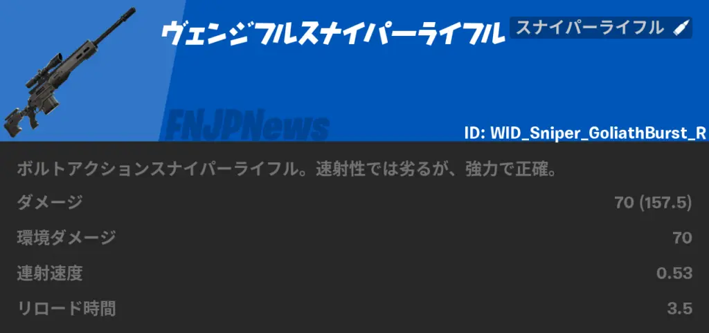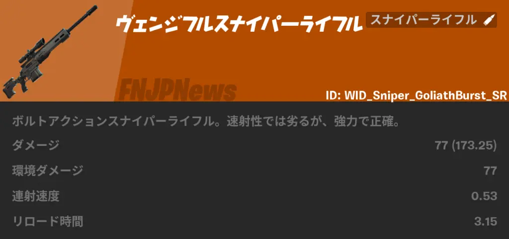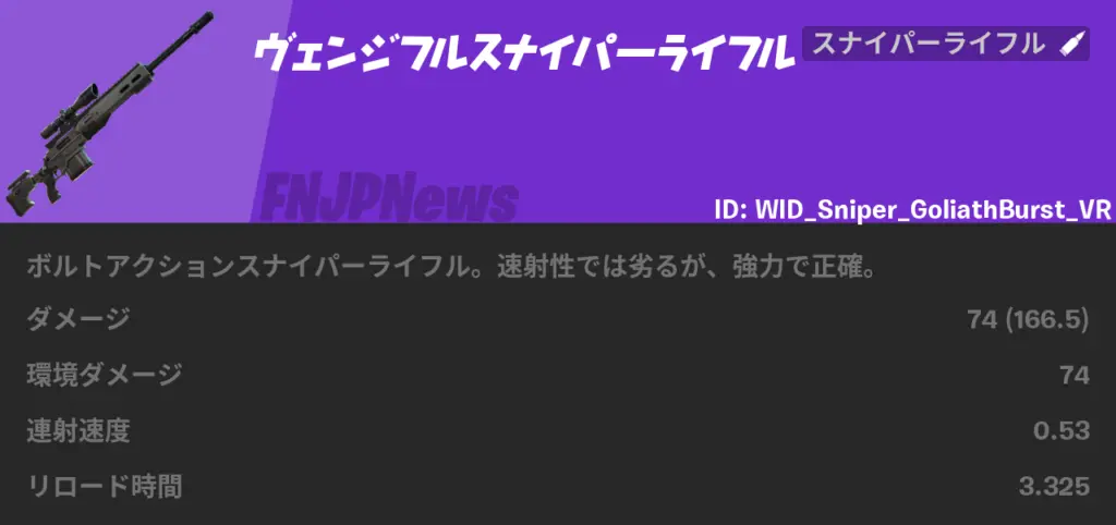 The post 【フォートナイト】「ヴェンジフルスナイパーライフル」性能まとめ first appeared on フォートナイト 攻略情報サイト | FNJPNews.