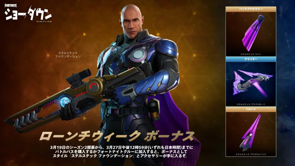 バトルパス(800 V-Bucks)を購入すると、「崇高なるアイスキング」を即座に獲得可能です。さらに、日本時間3月27日午後0時59分までの早期購入者には、ローンチウィーク限定スタイル「ステルステック ファウンデーション」が贈られます。