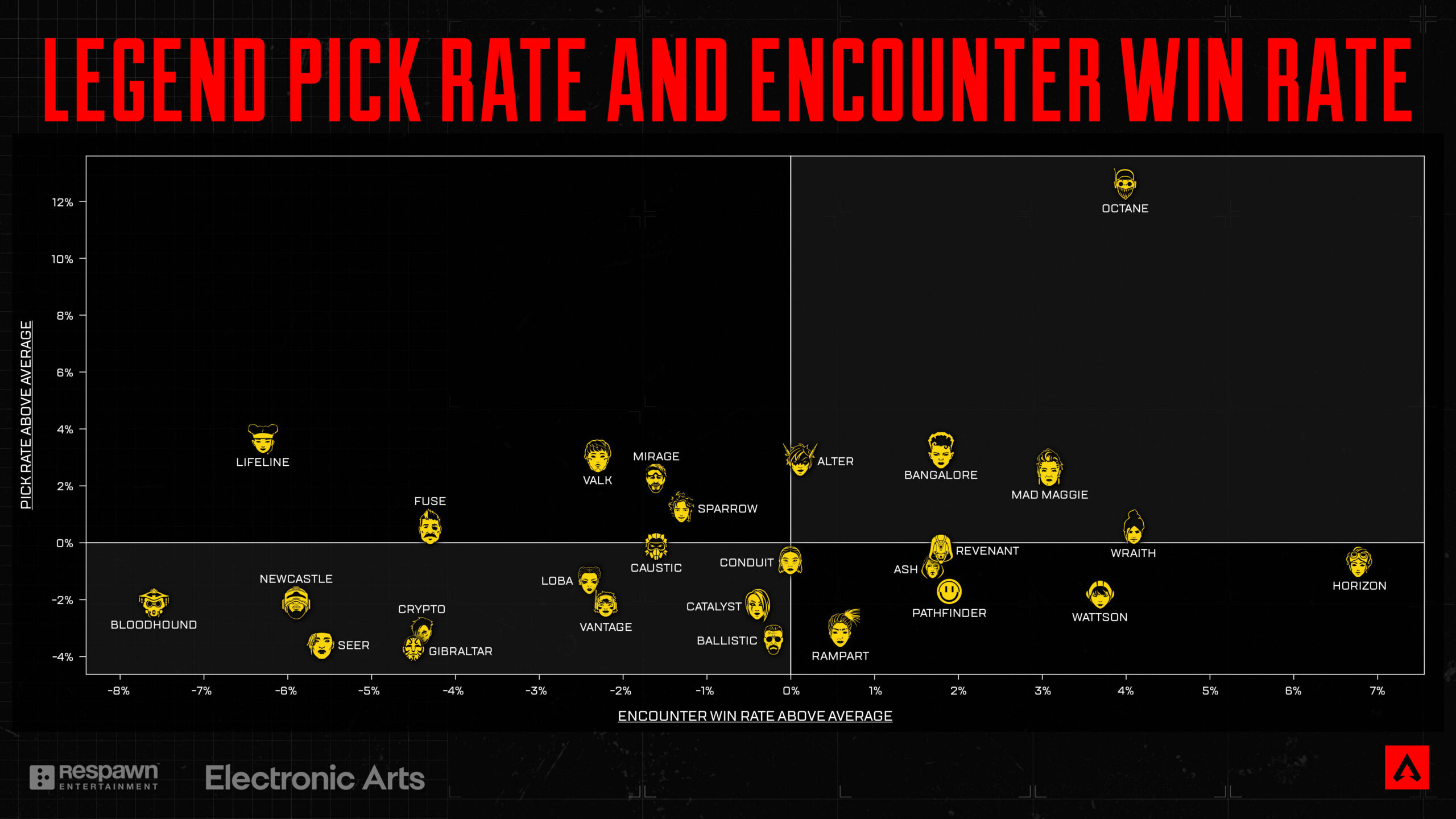 リワークされたアッシュ、ヴァルキリー、オクタンなどのキャラクターは、それぞれ高いピック率を記録した「旬の時期」がありましたが、Apexにおいて「必須」となるデュオやトリオの存在がこの12ヶ月でほぼ消滅したことを嬉しく思っています。