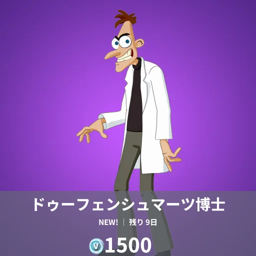 本日のアイテムショップにディズニー・チャンネルで放送が開始されたアメリカのアニメ「フィアニスとファーブ」から、マッチョなペリーとドゥーフェンシュマーツ博士がフォートナイトの世界に参戦しました。