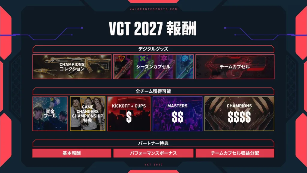 - 非パートナーチーム: 大会への参加資格を得るごとに報酬が支給されます。戦績次第では、下位のパートナーチーム以上の報酬を得ることも可能な設計となっており、競技への投資がより健全に循環するようになります。