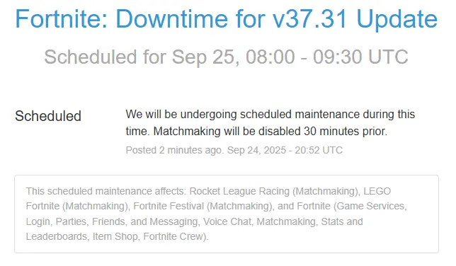 【フォートナイト】v37.31アップデートのダウンタイムはいつ終わる?