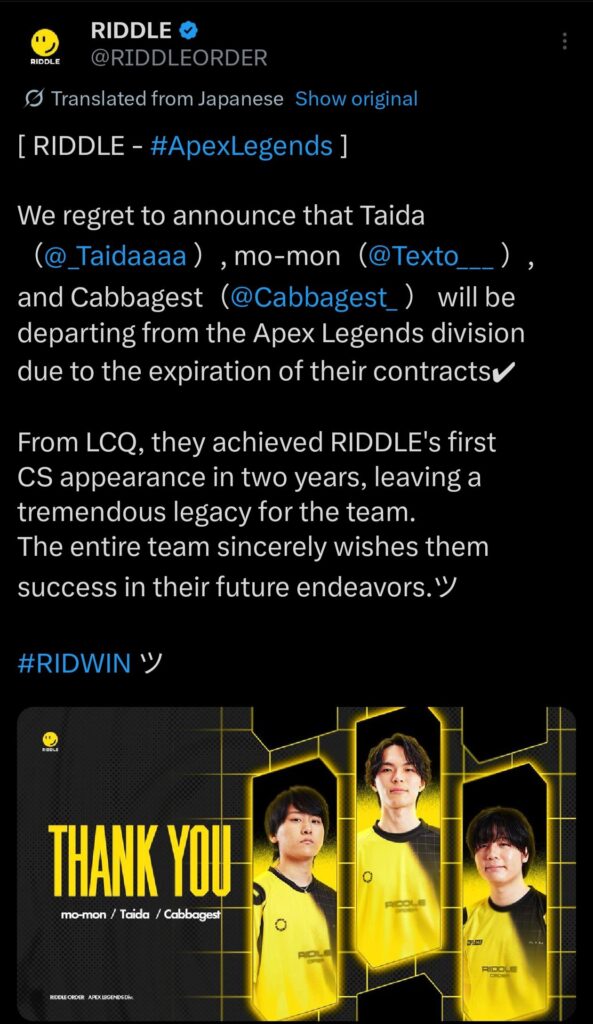 【Apex】Riddleが選手2名とコーチを放出 → 海外の反応まとめ