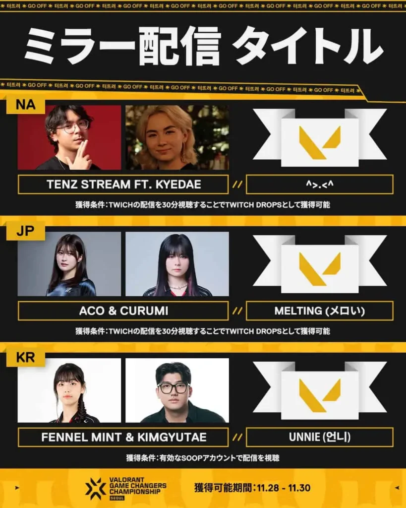 VALORANT GC Championship 2025、ミラー配信視聴で限定タイトルが獲得可能、11月28日-30日の期間限定で「^>.<^」「MELTING(メロい)」「UNNIE(언니)」を配布