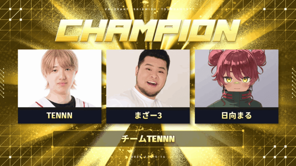 「VALORANT スカーミッシュトーナメント」チームTENNN(TENNN / まざー3 / 日向まる)が優勝、決勝でチームTonboを下し初代王者に輝く